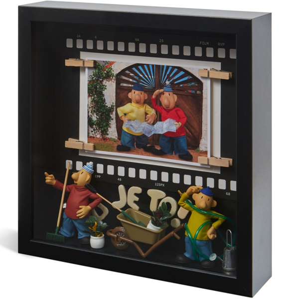 Boks kolekcjonerski z aranżowaną według autorskiego pomysłu scenką z legendarnej animacji Pat i Mat znanej także jako Sąsiedzi zatytułowany : OGRODNICY